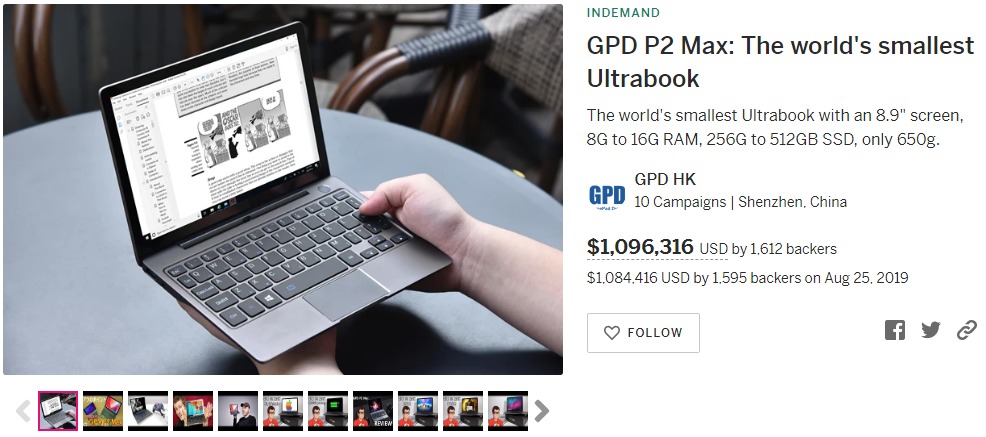 さて、その約1週間後の8/25に、GPD P2 Maxもファンディング終了。こちらは期間内に$100万を達成。そして早々に発送が開始されているようです。